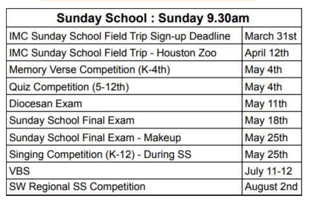 1. The IMTC VBS will be held from June 28th to June 30th. Theme for the year is, Camp Firelight: A Summer Camp Adventure with God. The key verse is “Whenever I'm afraid, I put my trust in You.” Psalm 56:3.